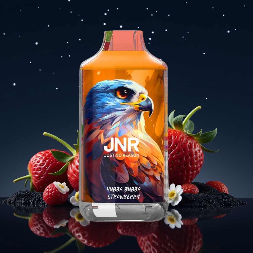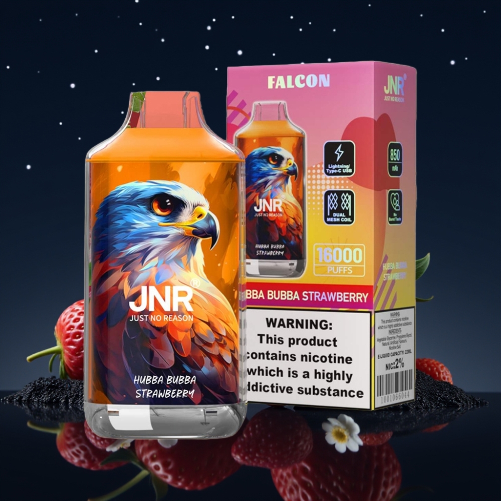 JNR Falcon 16000 Puffs Disposable Vape – Dvigubas Tinklinis Šerdis, 850 mAh, 22ml, USB Type C & Lightning, LED Ekranas, 0%/2% Nikotino, Hubba Bubba Braškė